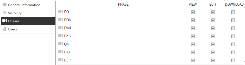 Phases option allows administrators to define group permission on different phases. A permission group can have three kinds of phase permission: