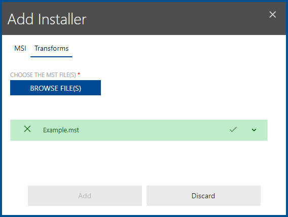 << Click to Display Table of Contents >> RayManageSoft Unified Endpoint Manager > 3.0 u1 > User Guide > Applications > Package Details > Installers > Add a Windows Installer Transforms |