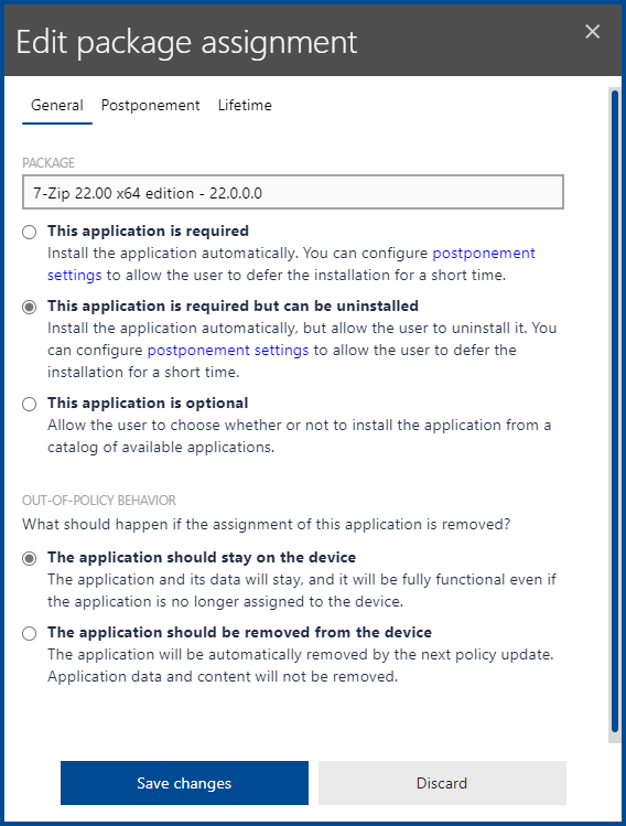 oThis application is required but can be uninstalled: If this option is chosen, the installation will be installed, but the user has the option to uninstall it afterward. The user can defer the installation for up to a predefined amount of time. The time frame can be configured in the Postponement tab.