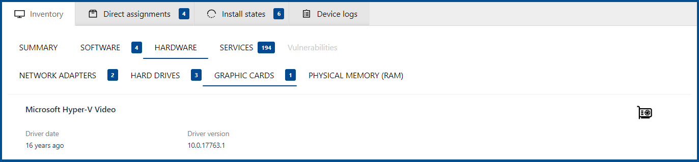 << Click to Display Table of Contents >> RayManageSoft Unified Endpoint Manager > 3.1 u3 > User Guide > Endpoints > Computer Devices > Device Details > Inventory > Hardware Graphic Cards |