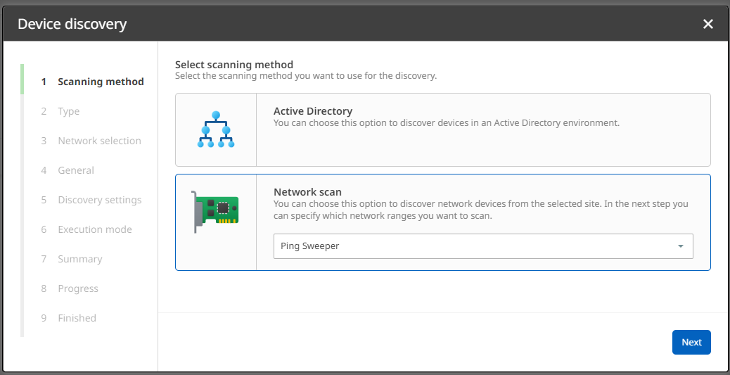 2.Select Ping Sweeper as a scanning method under the Network scan option . Then click on Next to proceed.