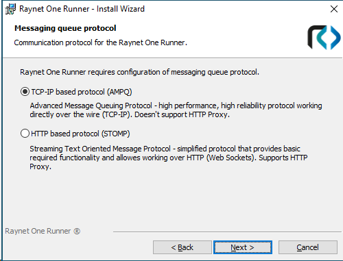 7.Select the protocol used during communication through the Raynet One URL. The available protocols differ in the level of abstraction, adoption and performance. Click on Next to continue.
