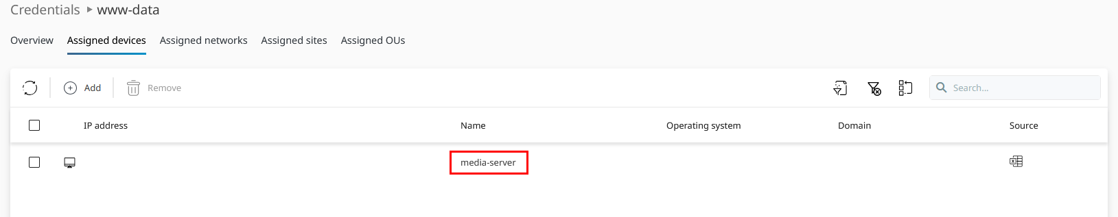 Excerpt of the device-credentials relationship graph of the provided scenario. We want to add the highlighted (red) relationship between the MEDIA-SERVER device and the www-data credentials to the platform.