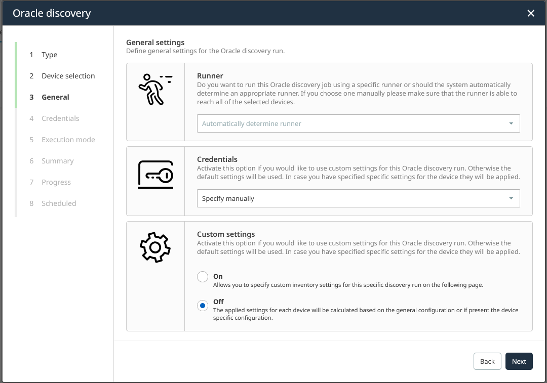 4.Under General Settings, specify the runner and credentials. Select to specify the credentials manually. Keep the Custom settings turned off. Click on Next to proceed.