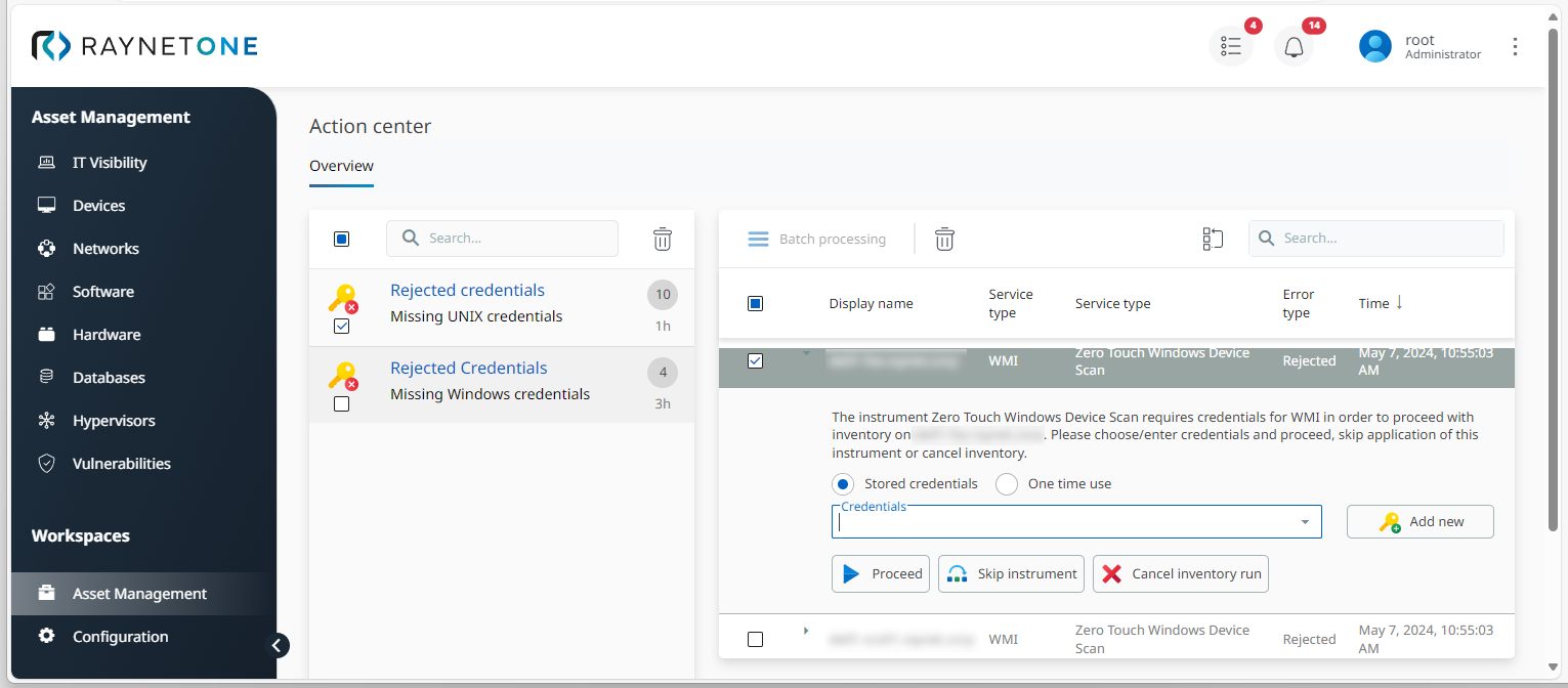 While you can rely on Raynet One as a low-maintenance and full-service data management platform, occasionally there's still a need for user interaction, e.g. with regard to credentials and custom configurations. The Action center (located in the header) simplifies interaction, though, as it notifies you about issues occurring during automated jobs and changes in your IT landscape. Here's how to access the Action center and gain information on your IT assets and managed environment.