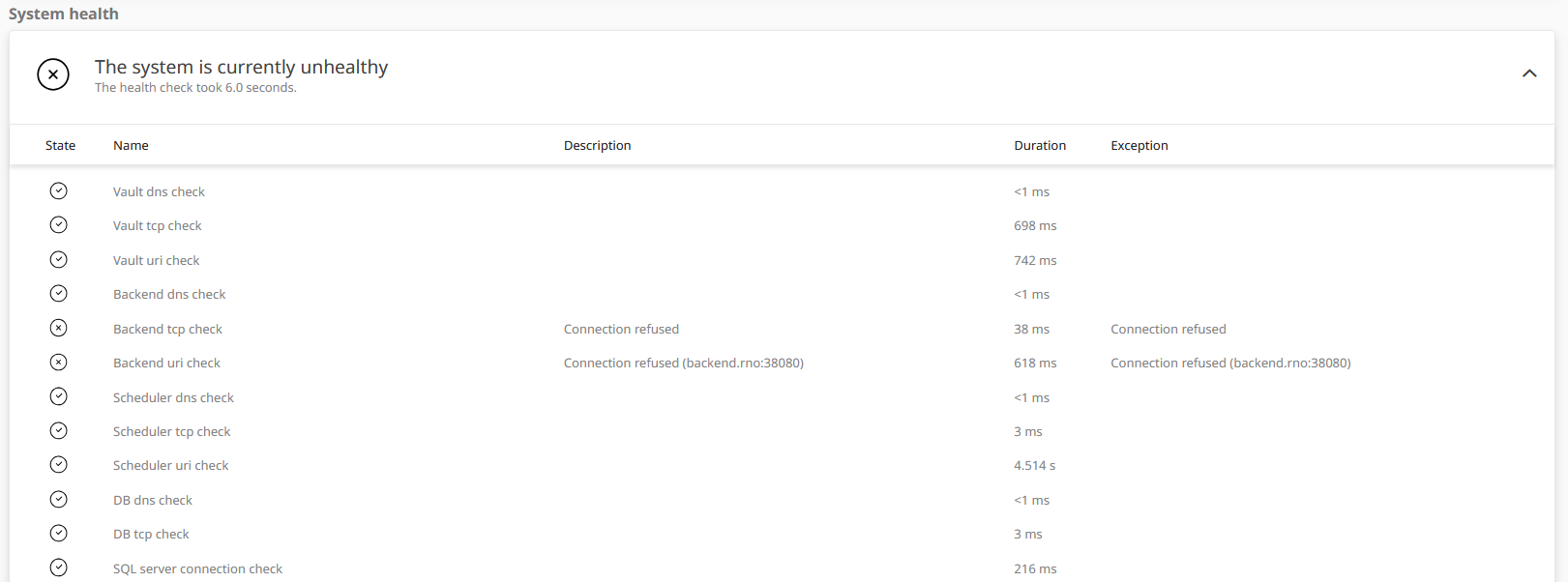 Under System Health, you are provided a list view of all health tests which were processed lately. All health tests run and evaluate as a whole set. The total health check execution time is displayed in the description line below the section's heading, being 6.0 seconds in the sample image. Health tests are classified into either successful or failed ones. Examine the list to evaluate the correctness of the system's inner workings. For any failed health check, read the description column for a helpful explanation and the exception column for technical failure details. Contact product support including these system health details to troubleshoot any issues regarding general platform performance.