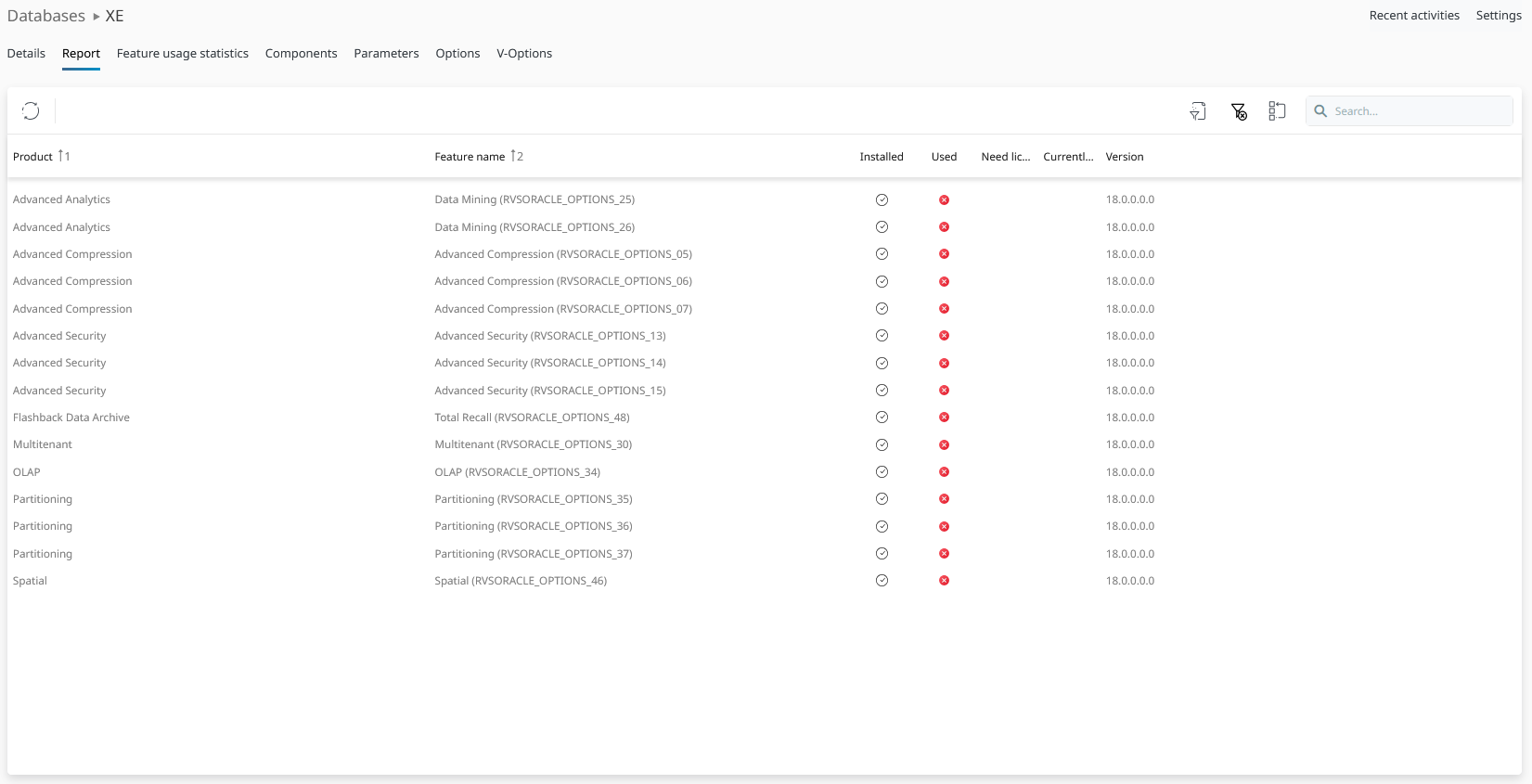 The report tab lists the products and their features/options used in the Oracle instance. The product names are taken from official Oracle sources. Use this information as a powerful guide to handle the Oracle licensing question. Compare the Oracle database products used with the ones available from Oracle to review your IT strategies: Do you invest into the right Oracle products or do you need to change track?