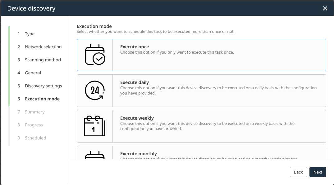 7.Define an execution mode for scheduling your discovery run. Select the Execute once option and click on Next to proceed. However, you can choose to trigger the job daily, weekly or monthly according to your requirements. Job automation is explained in a later chapter.