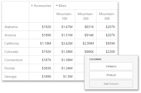 If the Columns or Rows section contains several data items, the Pivot column and row headers are arranged in a hierarchy and make up column and row groups.