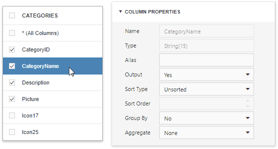 Specifies a custom column name (alias). Include a column into a query to enable this option. Aggregated columns should always have an alias. |