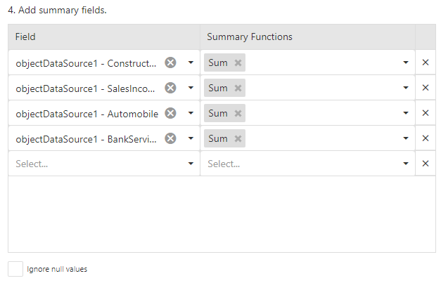 Contains a table with a single column that has as many labels in cells as there are summary functions you specified for each field in the Report Wizard.