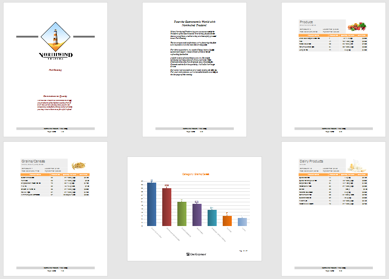 You can create pages in a separate report and merge them into your base report. This enables you to print and export merged pages as a single document, and preserve the original report page settings and orientation.