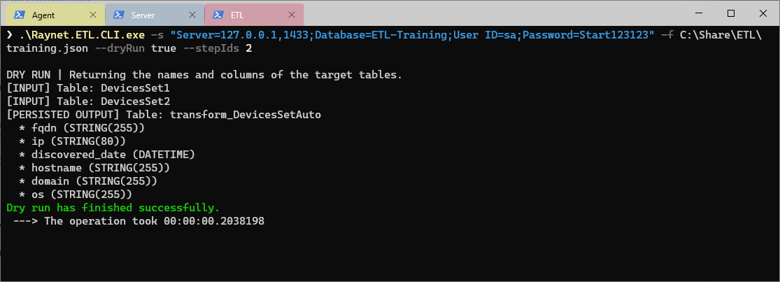 Dry mode enables you to see which tables are required and produced by a given JSON file, without actually doing the transformation. This process is fast as only minimal set of metadata gets pulled from the database. To activate dry mode, add --dryMode true to the command line. If the switch is present, you can also use another parameter --stepIds which may contain space-separated list of step identifiers to be analyzed. If no step ID is provided, then all steps from the selected JSON file will be analyzed.