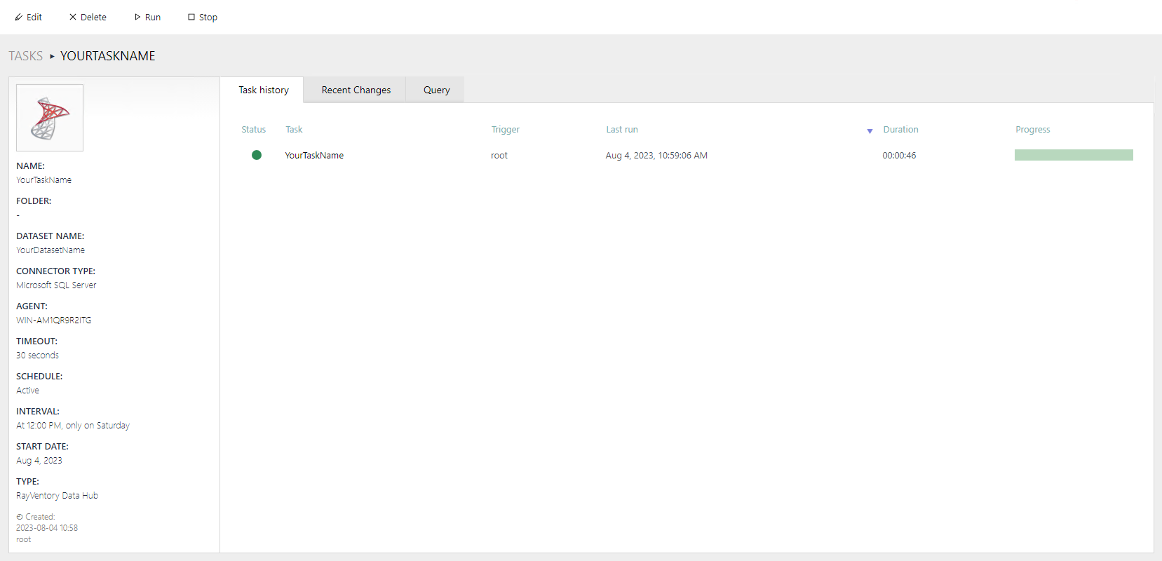 In the Task details view for your task, all information about the task will be shown. It is also possible to manually start the task in this view by using the Run button located in the top left corner of the view.