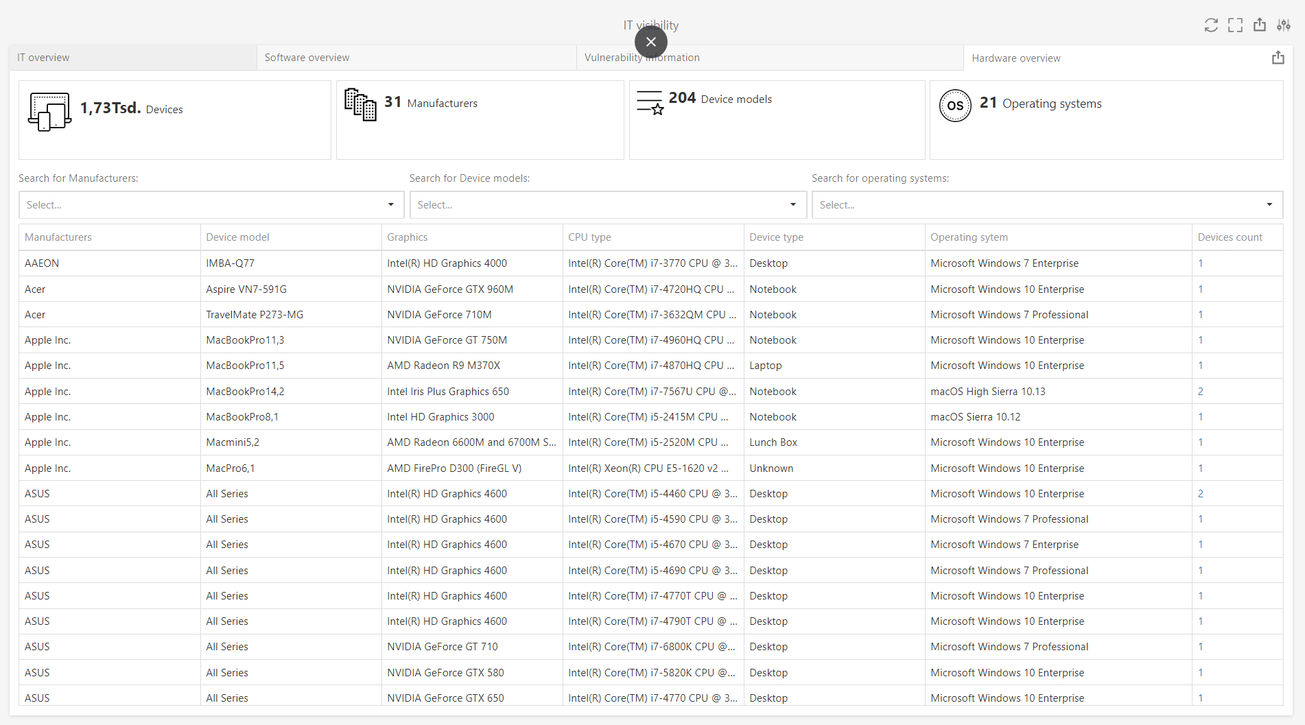The Hardware overview tab contains information about the hardware data that has been imported by the Microsoft SQL Server connector. It contains information about the overall number of the devices, the manufacturers, the device models, etc.