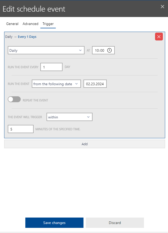 Tip: Via the Add button, you can add multiple events and triggers related to the same device schedule. You can further delete unnecessary or outdated events via the red cross button. |