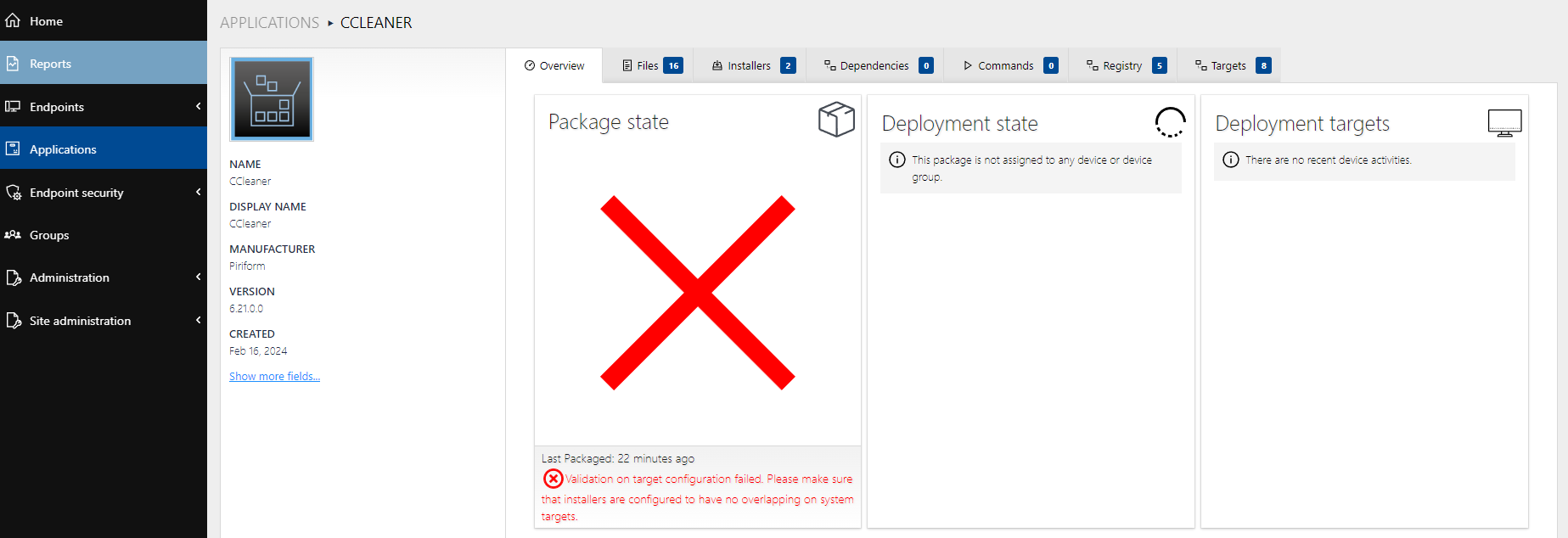 Tip: In order to use the Targets tab, you must activate Overwrite package target configuration. Also make sure that additional installers of the same package are not overlapping on your managed devices. Via the Package state in displayed in the package view, you can check if you created overlapping targets that cause installer conflicts. In case of target conflicts, adapt your settings under the Targets tab in the Add installers dialog.