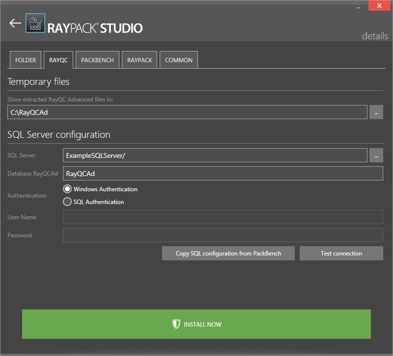 In the RAYQC tab the settings necessary to install RayQC are configured. These settings are comprised of the folder which is used by RayQC Advanced to extract files and the SQL server connection which is needed by RayQC Advanced.