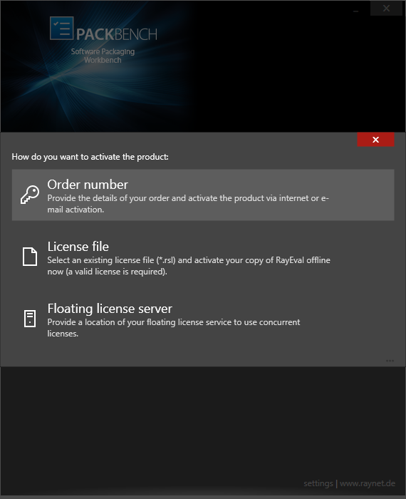 Online activation using a valid order number received from Raynet (recommended for most users).