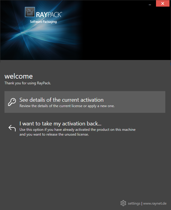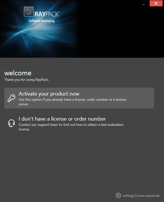 On the initial start of RayPack, the licensing wizard is shown. If the need to transfer an existing license arises, the license wizard can be started manually. There are a variety of ways in which a license can be activated and below they are described in detail.