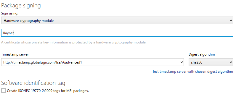 In this example, we assume that you have two files: a digital certificate file Raynet.pfx and a file with additional certificate to add to the signature block Raynet.cer. Both names are the same as in the next chapter, which discussed creating a self-signed certificate. Only the PFX file is required, CER is recommended but optional. The following image shows the desired state of the signing settings: