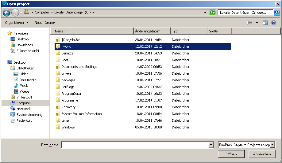 This section describes the process of opening an existing project file. On clicking the open capture project button from the Home Screen, a typical "File-open" dialog that has been specifically configured to filter files based on the capture project format will be presented. Selecting the file and then choosing the open button will open the file / project in RayPack. This can also be achieved by simply double-clicking on the file, which will also open the file / project in RayPack.