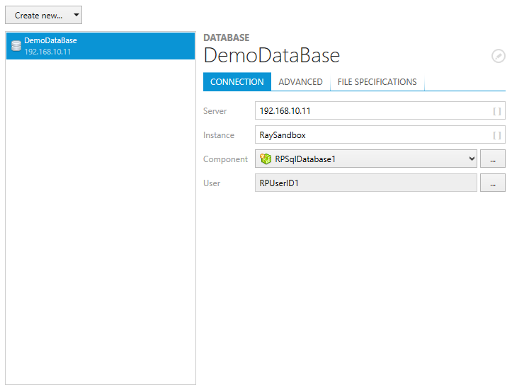 Note: Another view of the Visual Designer, SQL scripts, bases on the SQL database objects created within this view. Identifying the target database for SQL script execution is only possible, if a database object itself has been provided with connection information before. Therefore, adding SQL database objects in RayPack is not only required if a new database has to be created on the later target machines of the package, but as well if SQL scripts have to run on already existing SQL databases on those target machines. SQL database objects may be used as mere database connection definition references. |