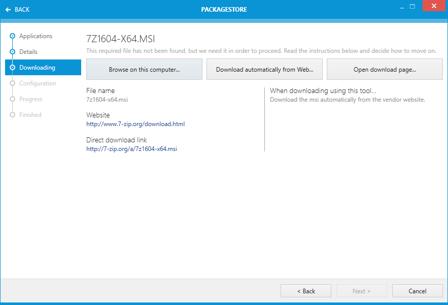 For recognized setups, this option lets user select a setup file (EXE/MSI/other format) that has been previously downloaded. Any required post-processing is executed automatically.