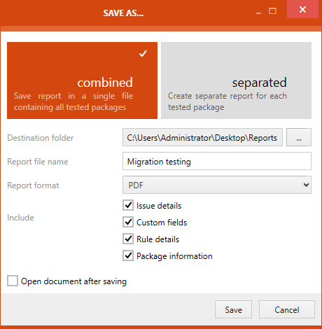 As first step in the Save as... dialog, users have to decide if the result of the test should be saved either combined or separated. If the combined option is chosen even if multiple packages have been tested, the results for all packages will be saved in just one single report file. This is also the default option. If the separated option is chosen, a report file will be created for each of the packages that were part of the test.