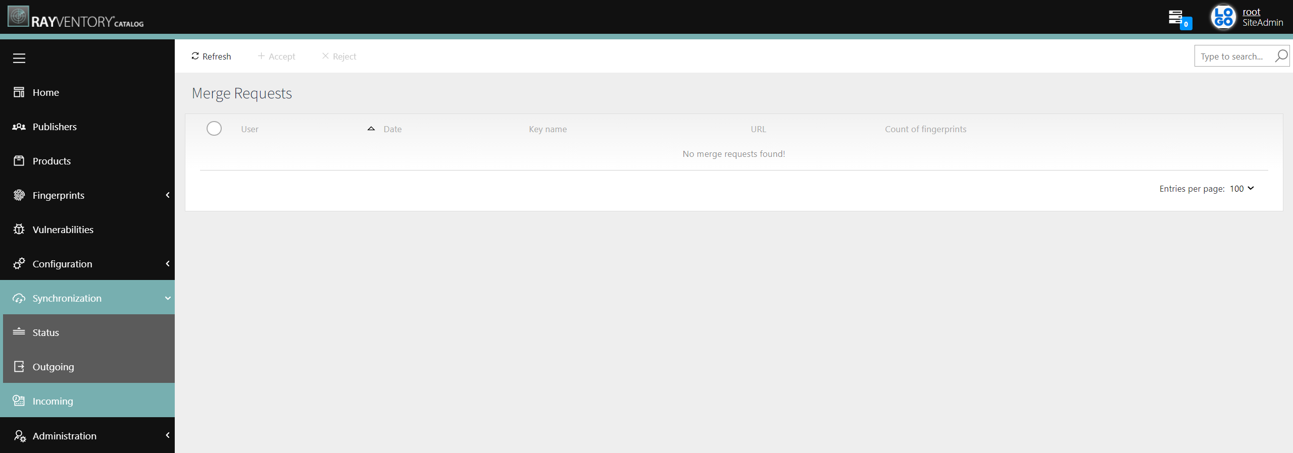 The Incoming page contains a list of the merge requests that are incoming from other instances of RayVentory Catalog.