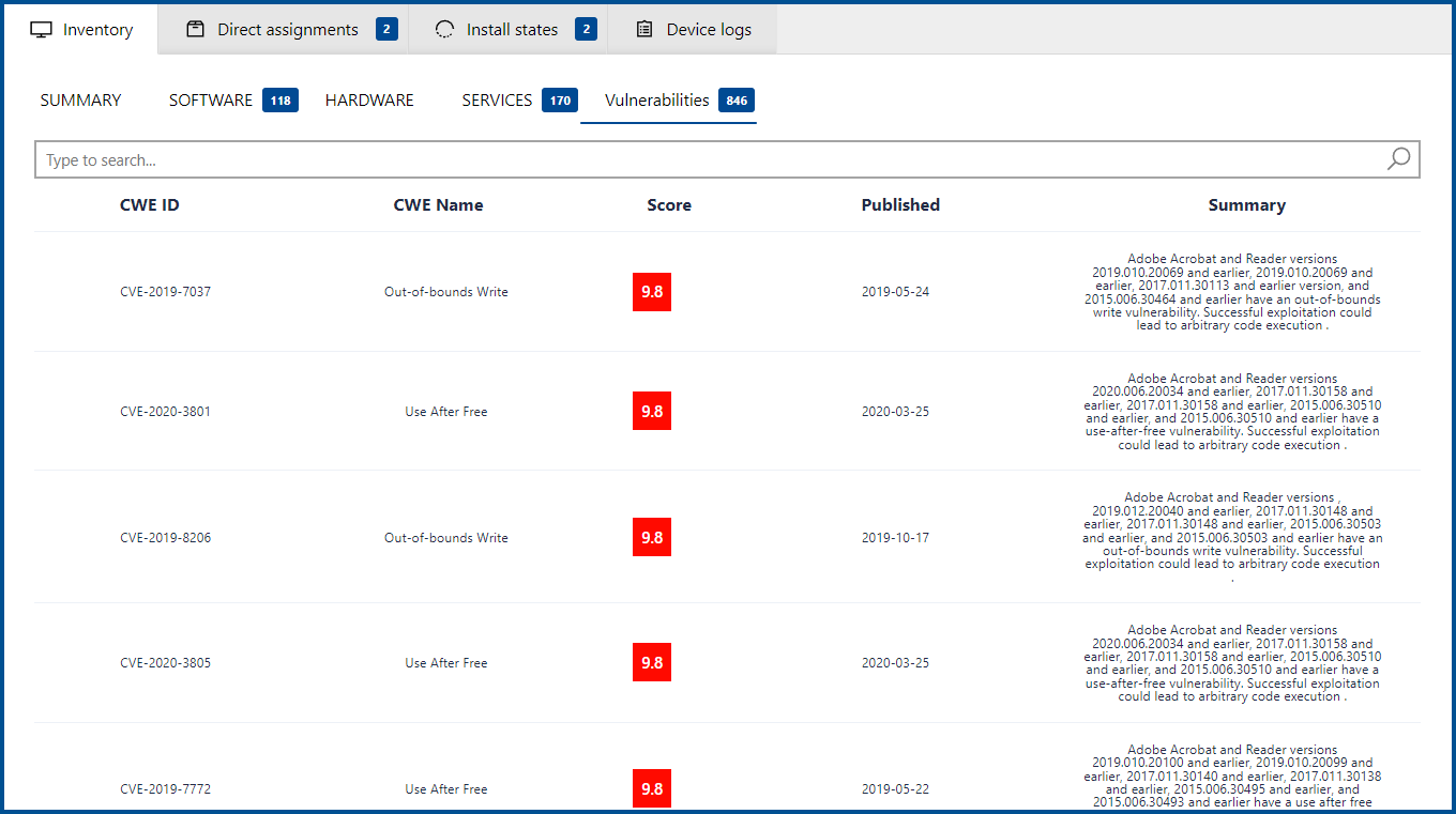The raw data that has been collected by the inventory of a device, will now be automatically processed and enriched and the specific software information for a device will now be available. Based on this information, a list of known vulnerabilities for this device will be created.