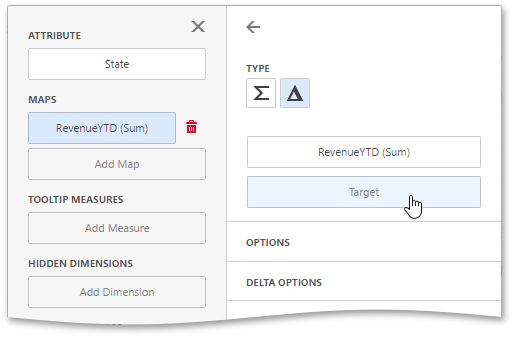 Delta is bound to two measures that provide two values: the Actual value and the Target value. The difference between these values is displayed on the map.