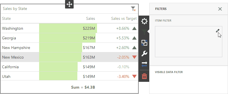 •Dashboard Item Filter: sales percentages are recalculated based on the visible data.
