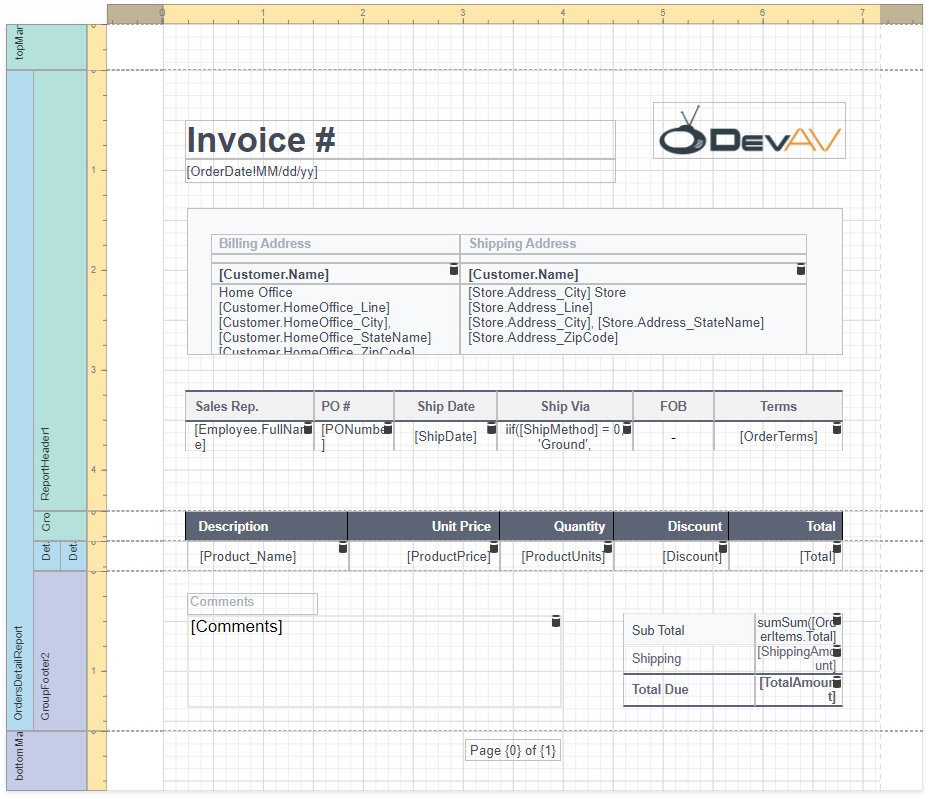 In this tutorial, the report shows a purchase order. A Detail Report band displays order details and customer information. An inner Detail Report band lists products included in an order.