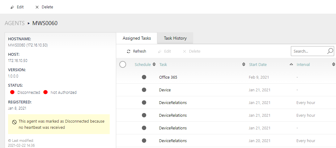 Note: Deleting an agent is only possible when no task is assigned to it. A deleted agent can re-register at the RayVentory Data Hub server at any time if the agent service is still running. It must be explicitly reauthorized before it can request assigned tasks again |