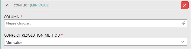 •CONFLICT RESOLUTION METHOD: Select the method used to resolve conflicts. The available methods are First non-empty value, Join values with separator, Max value, and Min value. If Min value is selected, the following further settings will be available.