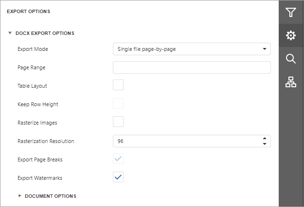 Before exporting a document to DOCX format, you can specify DOCX-specific options in the Export Options panel.