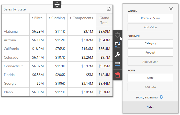 The image below shows a sample Pivot dashboard item that is bound to data.