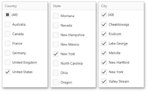 You can also create a set of related filter elements containing relevant filter values. For instance, in the image below, the State filter element contains states related to the 'United States' value, while the City filter element contains cities related to the 'New York' value.