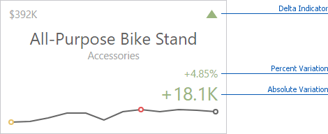 Cards allow you to visualize the difference between the actual and target values using special delta values and a delta indicator. If the default layout is used (Stretched layout type), the card displays the following delta values/elements: