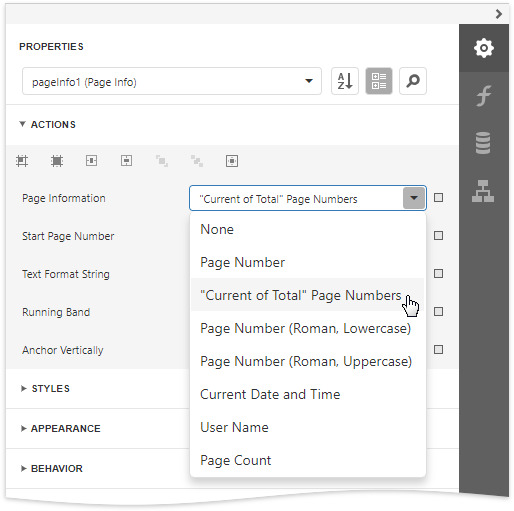 Note: Because usually this information is displayed in the Page Header/Footer and Top/Bottom Margin bands, you cannot bind the Page Info property to a field from a data source. So, in order to display dynamic information, use the Label or Rich Text controls instead. |