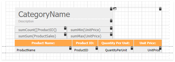 1.Create a report bound to the same data source as the chart report, and arrange a layout like the one shown below:
