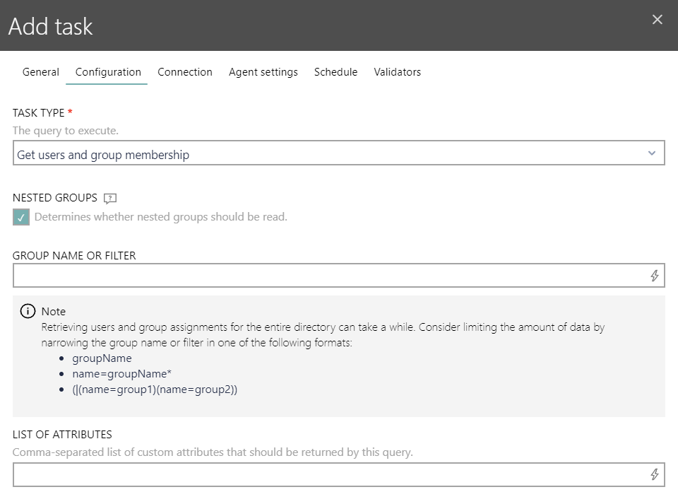Active Directory tasks require the selection of one of multiple predefined types or a custom query. Additionally, several optional properties are available for configuration. In case of a custom selection, the complete filter query is to be specified by the user.