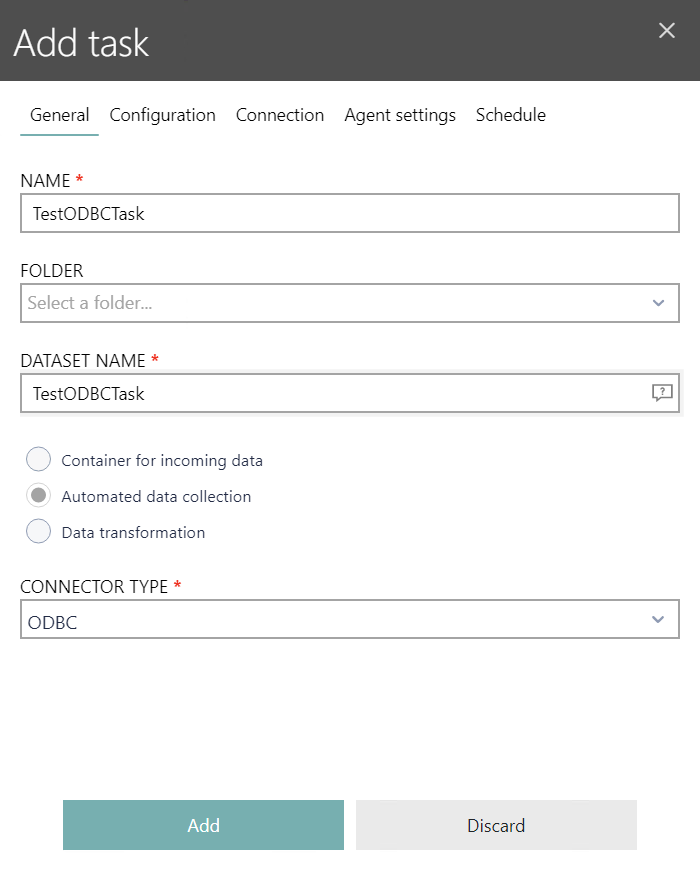 In the General tab, enter a name for the Task into the NAME field and a name for the dataset into the DATASET NAME field. Select ODBC as CONNECTOR type and switch to the Configuration tab.