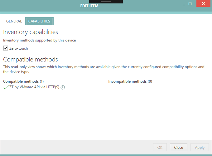 The capabilities section allows users to precisely configure which low-level capabilities each device supports. Currently, only Zero-Touch execution is available for vSphere / ESX connections.