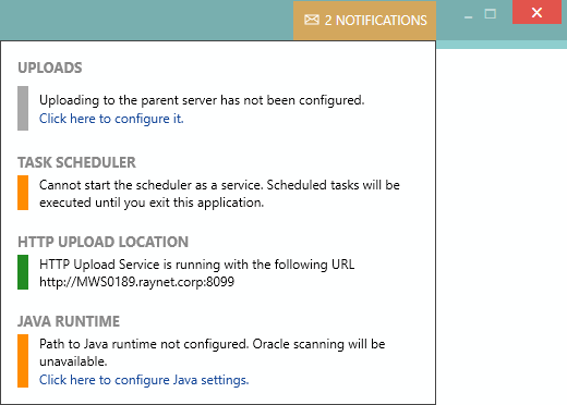 •Yellow - important messages (for example missing non-critical configuration, pending uploads etc.).