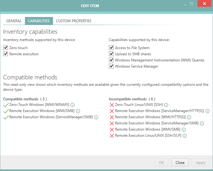 The combination of supported capabilities is used by the Inventory Wizard to determine which methods are compatible with which target. For example, unchecking the Zero-Touch option for a device will render it scannable by remote execution methods only.