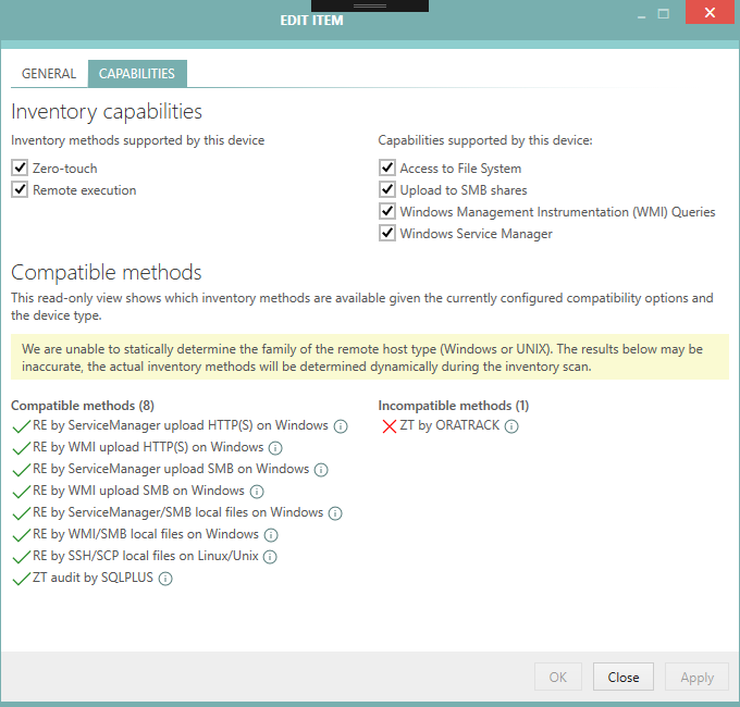 The combination of supported capabilities is used by the Inventory Wizard to determine, which methods are compatible with which target. For example, unchecking Zero-Touch options for a device will render it only scannable by remote execution methods.